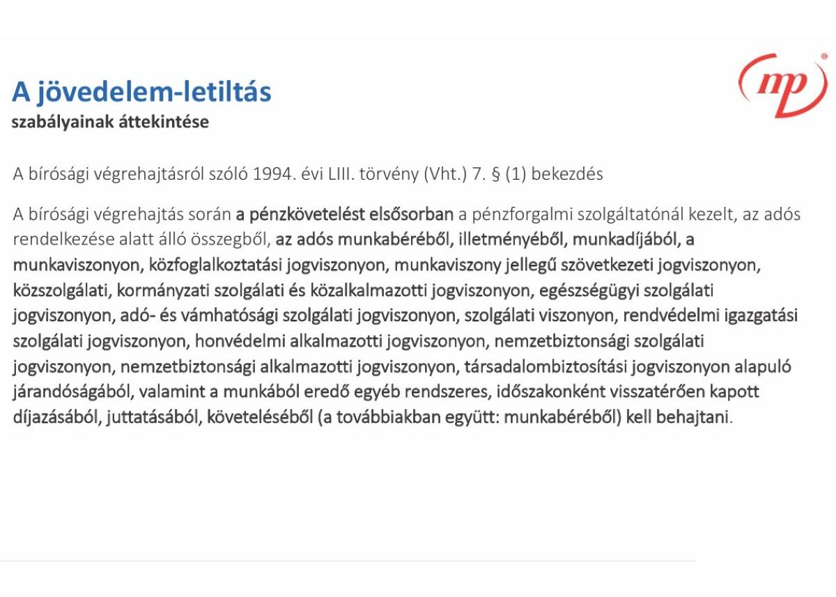 Ha több letiltás van párhuzamosan érvényben, a 40.000 Ft feletti összegnél a Vht. alapján arányosítani kell. A gyakorlatban a kétharmad–egyharmad megosztás lehet az irányadó, de az előadó rávilágított arra is, hogy a jogszabály szövege nem minden helyzetre ad egyértelmű megoldást.